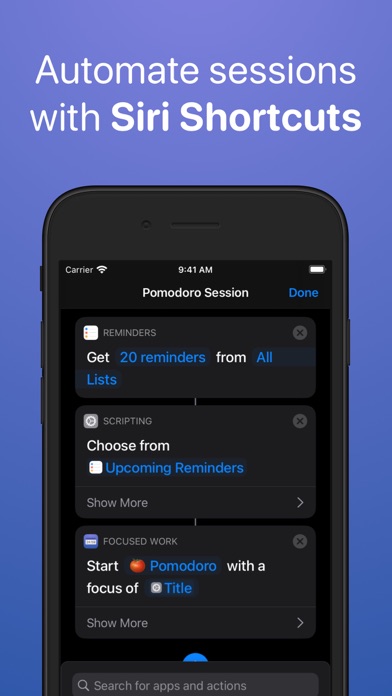 Automatically trigger Shortcuts while you progress through a focus session and its stages. Automations can be triggered at Session Start/Finish and Stage Start/End.