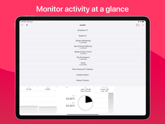 SimplePi is the Swiss army knife utility app for monitoring, controlling, and managing your Raspberry Pi using your iPhone and iPad.