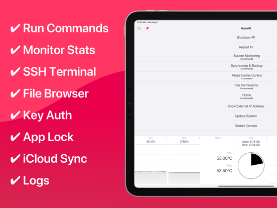 Run commands on your Pi with a single tap. Want to have your own commands? No problem. SimplePi lets you add as many commands as you wish.