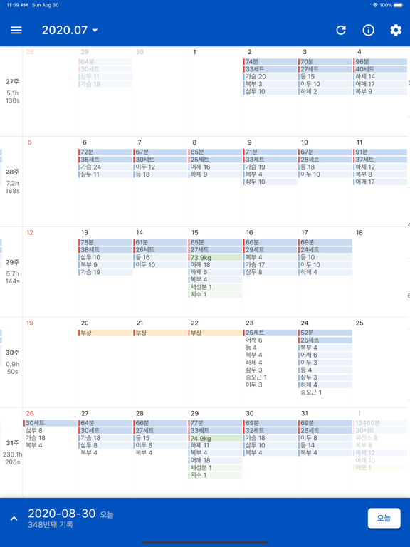 - 캘린더 메인 화면: 운동 부위, 체중, 메모 등의 요약 정보