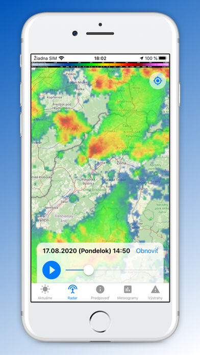 Pred nahlásením chyby prosím skontrolujte stránku SHMÚ, ak sa informácia nezobrazuje korektne tam (výpadky radarov, modelu Aladin), nebude sa zobrazovať ani v rámci aplikácie.