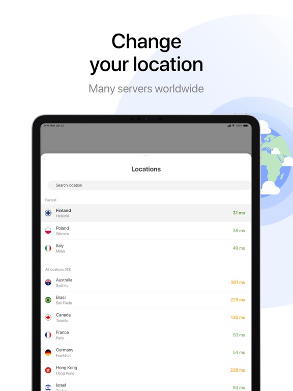 Get access to VPN servers with unlimited bandwidth located worldwide. The response speed of each server is displayed right next to it – so you can easily choose the best possible one!