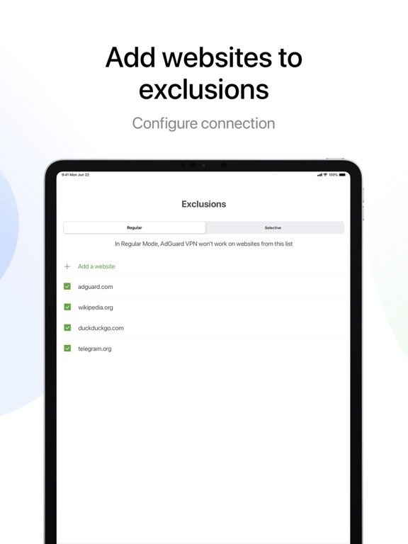 Add websites to the exclusions list. This is pretty convenient to choose yourself where VPN will be working, and where it won’t.