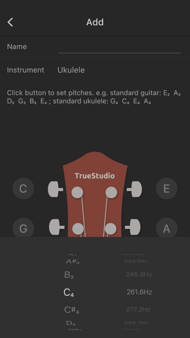 Ukulele Tuner uses your phone's microphone to listen and analyze the sound in real time and recognize which string you are playing, indicate if your string is too low or too high. You can also press the buttons of a string on the app to switch to manual mode, and then you can only tune the string you pressed. If you get this string in tune, then press next button and tune the next string.