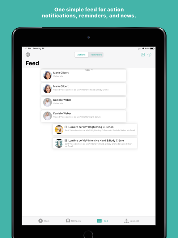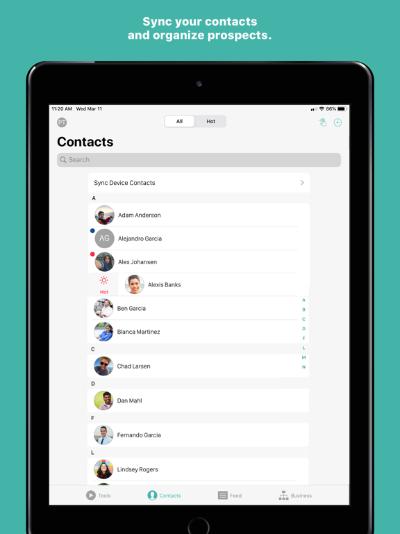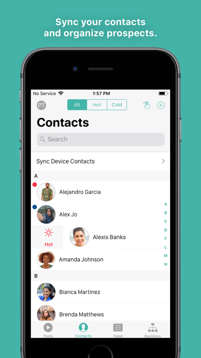 Contacts: Choose how to sync and manage your contacts. Swipe to sort them by interest level. You can make connections, add notes, or check out the Contact Feed to see the tools you've shared and contact actions.