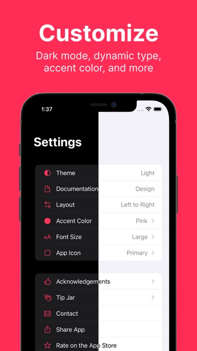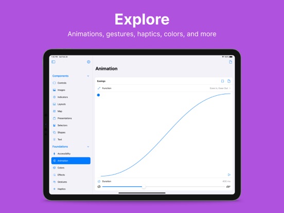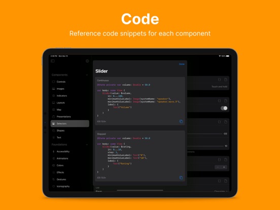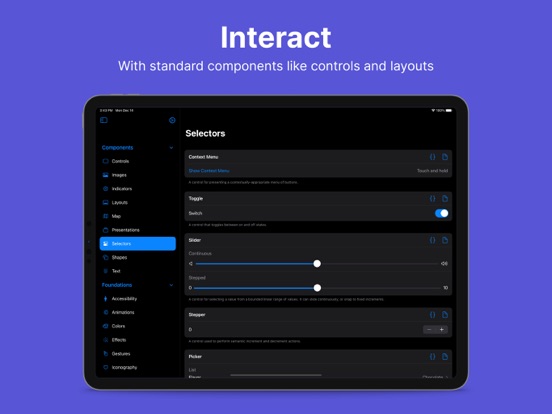 An interactive guide for SwiftUI to help designers and developers build better apps. – Code snippets and interactive examples for components like sliders, toggles, lists, and grids – Foundational elements like color, typography, haptics, gestures, animation, iconography, and accessibility – Quick access to Apple's official developer and design documentation – Also available on macOS