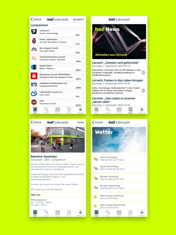 Die hoi! App von Pro Lörrach zeigt dir Geschäfte und Boutiquen, Restaurants und Imbisse, Hotels und Übernachtungsmöglichkeiten, Dienstleister und Industrieunternehmen, Freizeit- und Sportaktivitäten, Kulturveranstaltungen und Bildungsangebote.