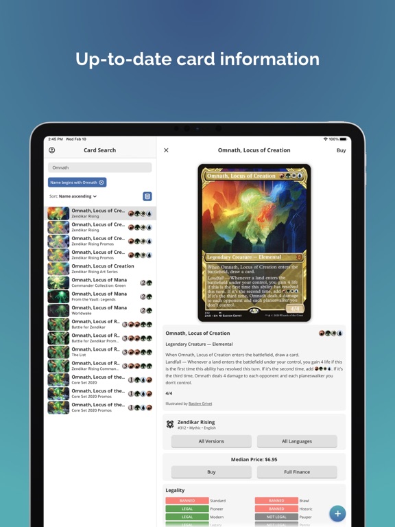 • View real-time card info, including price history, format legalities, and rulings