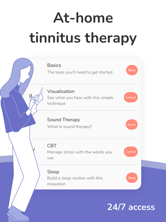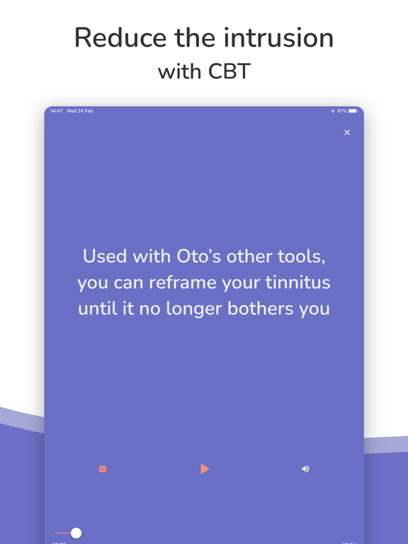 Oto brings together all the therapies proven to be effective in tinnitus management. This includes cognitive behavioural therapy (CBT), targeted mindfulness, relaxation therapy and education. Let Oto guide you on your tinnitus journey, and get equipped with the skills you need to take complete control of your tinnitus.