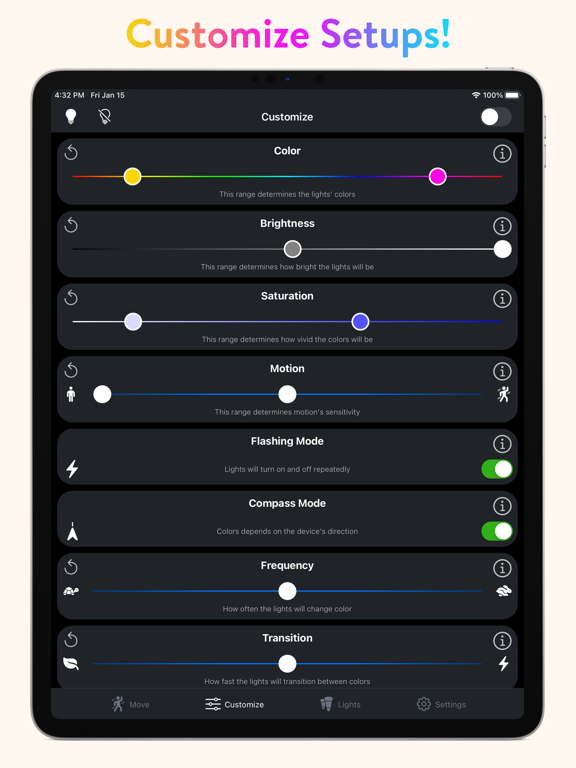 • Not in a dance mood? No problem! Set the custom light settings as you like them and let the app set the mood for you without moving. You’d have nothing to do, just sit back and enjoy the light show!