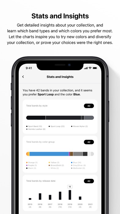 *Stats and Insights :: Get detailed stats and insights about your collection. Learn which band types, and which colors you prefer most. The charts, created on the device and never shared with us, can inspire you to try new colors and to diversify the collection, or just prove your choices were the right ones.
