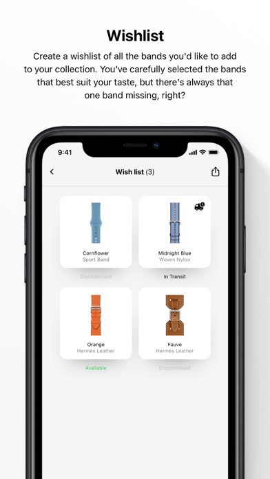 *Wishlist :: There‘s always that one band missing, right? Bands can be added to a wishlist, which gives you the best overview of what to look for next. Change the status of a band to "In transit" to keep track of the upcoming addition.