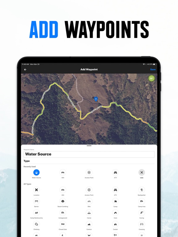 Add waypoints to the map to mark spots you loved, to remember where to explore next time, or to share with a friend. Make it a memory by adding photos. Customize your waypoints with icons for campsites, summits, swimming, fishing, hot springs, foraging, water crossings, and more.