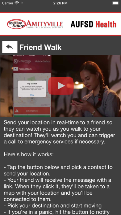 Amityville Health is an essential tool to enhance your child's safety at Amityville UFSD. The app will send you important safety alerts and provide instant access to campus safety resources. AUFSD Health is the official mobile safety app of Amityville UFSD.