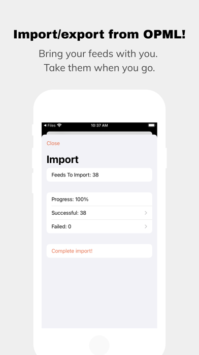 Import your feeds with an OPML file (if you have one from your existing RSS reader). Export your feeds into an OPML file if you hate "An Otter RSS" and want to move to another app. We'll understand. There are plenty of other apps out there and this one might not be the one for you!