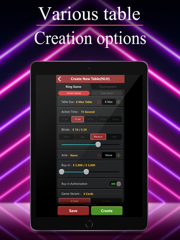 You can create your own game with a variety of games such as Hold'em, Omaha, Tournament, and many more game options.