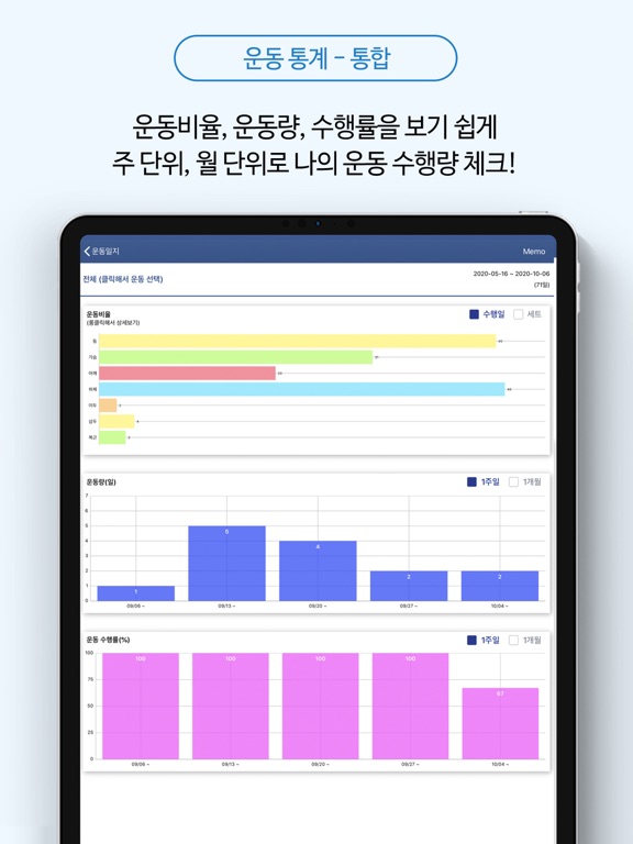 - 운동 부위 비율을 일자별, 세트별로 표시