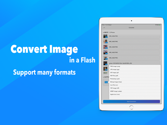 * Photo Converter: Transform photos or images to other extensions: you can convert into JPG, JPEG, PDF, PSD, GIF, PNG, BMP, TIFF, ICO and ICNS.