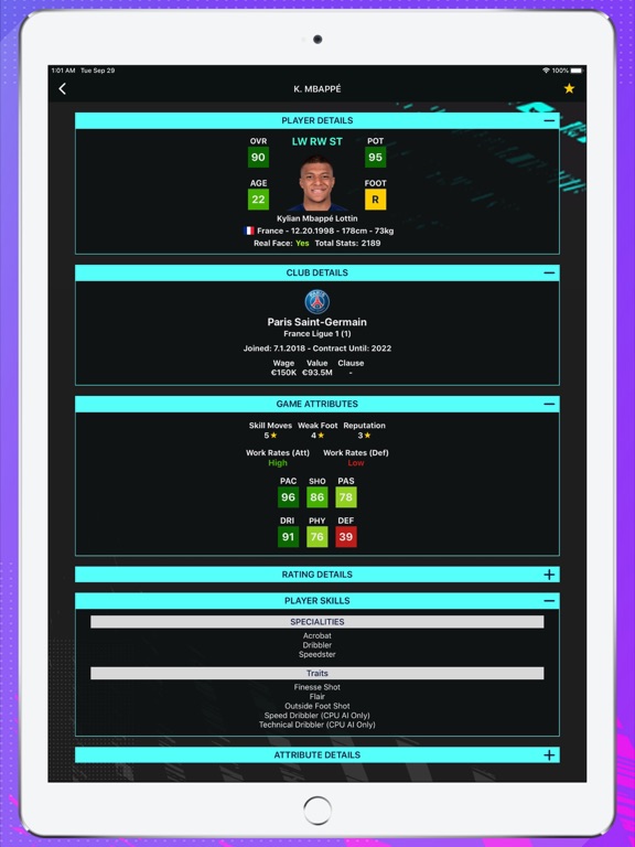 In Player Details page you are able to display very detailed data like Player Photo, Player Full Name, Preferred Positions, Preferred Foot, Date Of Birth, Height, Weight, Contract End Date, Wage, Value, Release Clause, Specialties, Traits, Weak Foot, Skill Moves, Work Rates, Total Stats and Player Ratings Per Positions.