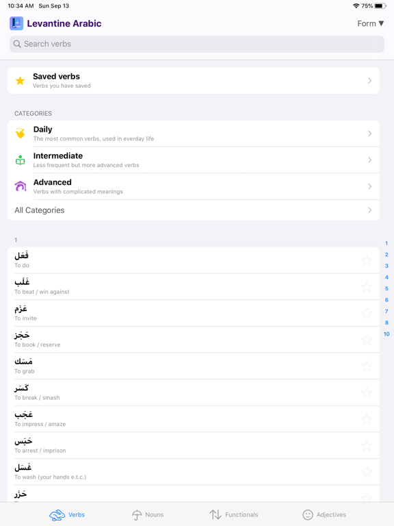 ● 700+ verbs grouped by verb form (I, II, III, IV, V, VI, VII,VIII, IIX, IX, X)