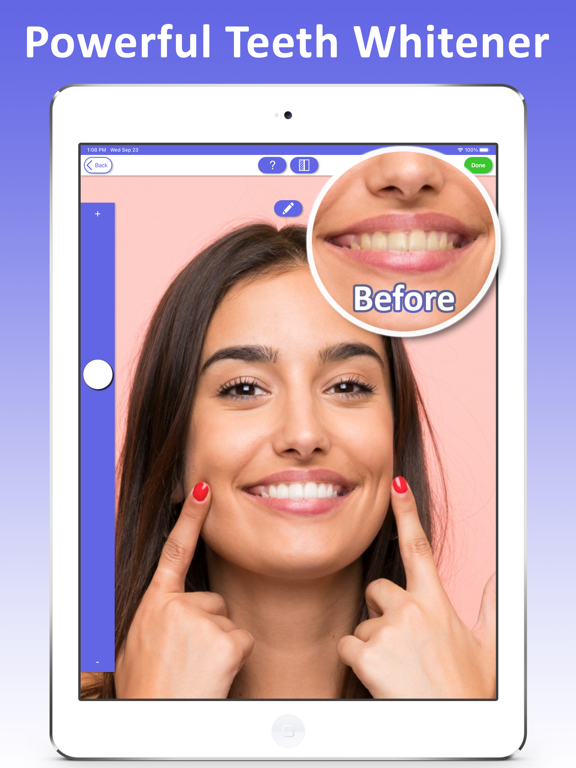 Automatically detect lips & teeth in photos and provides a complete set of tools to whiten your teeth and improve your smile. You can adjust how white you want to make them as well has change your lip colour to really make your smile shine. You can even morph the shape of your mouth to make the perfect smile in any photo.