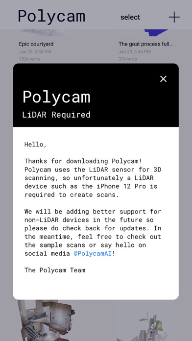 Please note: Polycam requires a device with a LiDAR sensor to work, and is not able to function otherwise. Currently, we are unable to restrict access on the App Store to only devices with a lidar sensor, so it is possible you may be able to download this app even if it does not function on your device. If this is the case, we sincerely apologize for the inconvenience, and hope you will consider re-downloading Polycam in the future if you happen to purchase a new device with LiDAR.