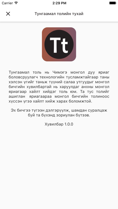 Tungaamal is a voice-activated Mongolian script dictionary that uses Mongolian speech recognition technology "Chimege" to recognize your speech. It shows your word in all possible Mongolian script versions and with their- version with corresponding meaning. Also, you can listen to the meanings of words with Chimege Reader.