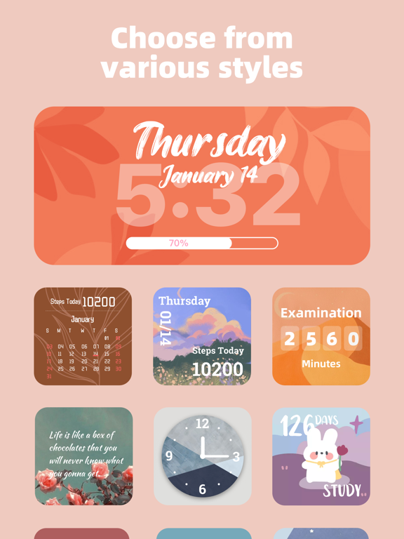 MagicWidgets allows you to add the countdown widget for reminders and time management. Countdowns can be accurate to seconds. You can customize countdown widgets for important upcoming events such as holidays, birthdays, anniversaries, parties, Thanksgivings, Christmas, Halloween, Valentine’s Day, exams, goals, etc.