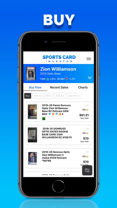 With this all new Sports Card Investor app you can scour through trending cards, search by player, price, year and sport, and also favorite your most searched stars! From there you can scroll through all of the buy it now options on eBay, view the most recent sale prices, and look at how the card is trending over the past 7 & 30 days with data powered by Market Movers.