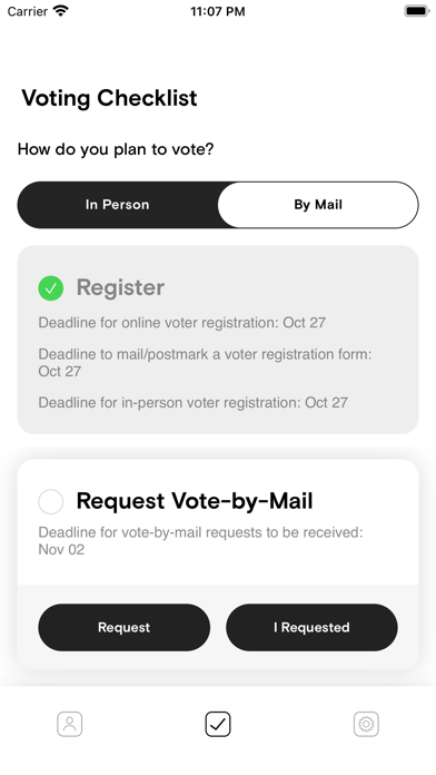 In the second tab of the app you'll see a voter checklist that can help you keep track of what you need to do to vote in the election. This includes registration, requesting a vote-by-mail ballot, preparing for voting by reviewing the election races and candidates, and finally, voting.