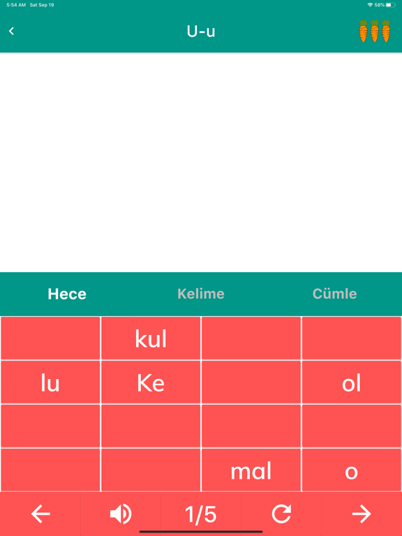 İstenildiğinde Ortada bulunan Hece - Kelime- Cümle butonlarından birisi seçilerek,