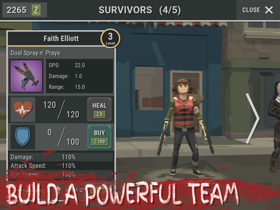 You can also manage your group of misfits by levelling them up to improve their health and stats, giving them body armor, and healing them if they were damaged in the previous round. Doing so before starting a wave will give you a huge advantage as the zombies get harder and harder to kill.