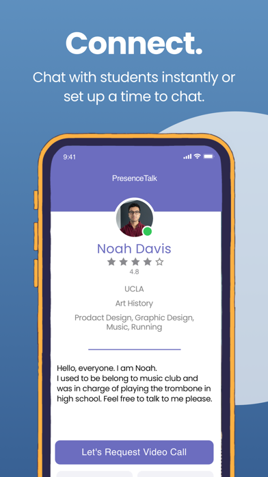 Talk to college students to gain advice and insight on college majors, student life, and more at universities across the US. When you hop into a one-on-one chat with a verified college student at your favorite university you can get real-time answers to your questions about college life. PresenceTalk helps you to get one step closer to figuring out which college major, student club, or university might be the best fit for you.
