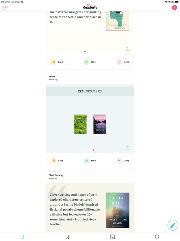 Whenever you take an action on a book—Save, Hide, or mark Done—you’ll never see that book in your feed again. You can always find it in the corresponding tabs, but removing it allows us to make room for titles you may never have heard of or missed reading the first time around.
