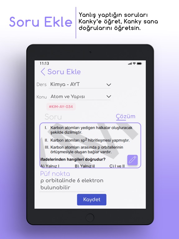 Yanlış yaptığın soruların çözümünü Kanky’e püf noktası ile birlikte ekle. Kanky sana istediğin zamanlarda hatırlatsın. Yanlışlarını doğruya çevir ;)