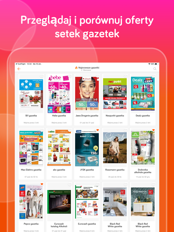 Nasza aplikacja "Gazetki promocyjne i promocje" gromadzi wszystkie aktualne gazetki z mniejszych i większych sieci sklepów z całej Polski. Nie chodzi wyłącznie o supermarkety spożywcze oraz budowlane, ale także o markety elektroniczne, modowe, z zabawkami, komputerowe, apteki i wiele więcej. Udało nam się nawet zgromadzić większość lokalnych sprzedawców. Jeśli chcesz oznaczyć swój ulubiony sklep, możesz to zrobić, po prostu klikając ikonę serca. W ten sposób zawsze będziesz na bieżąco ze wszystkimi uruchamianymi promocjami w swoich ulubionych marketach oraz stworzysz wygodną kolekcję, ze wszystkimi swoimi ulubionymi gazetkami.