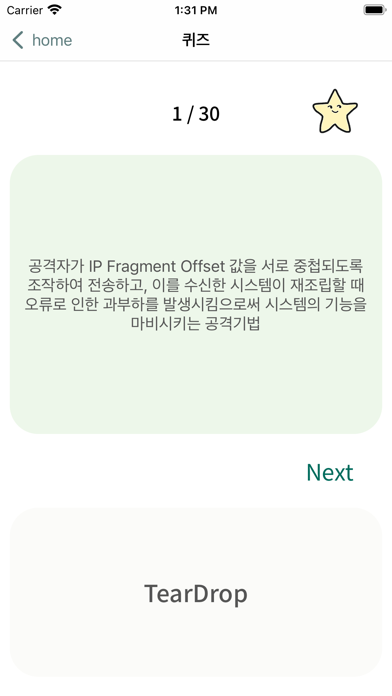대중교통을 이용하면서 혹은 책을 펼 수 없는 상황에서 틈틈이 암기를 할 수 있도록 합니다. * 아직 문제가 많지 않으나 차차 더 추가하도록 노력하겠습니다 * ● 단답형 - 설명을 읽고 해당 내용이 무엇을 의미하는지 맞춰보아요 - 헷갈리는 문제는 별표를 눌러서 나중에 따로 확인할 수 있어요 ● 두음암기 - 앞 글자만 따서 암기해 보아요 - 10개씩 띄어넘기 버튼을 활용해 주세요 ● 코딩연습 - 언어별 문제를 학습할 수 있어요 - etc. 버튼에서는 개념을 학습할 수 있어요 ● 모아보기 - 내가 별표 해 둔 문제들을 볼 수 있어요 - 퀴즈보다는 전체적인 학습을 원할 때 사용해 주세요 ● 플러스버튼 - 건의사항이나 불편사항 언제든 연락 주세요 - 피드백은 언제나 개발자에게 힘이 됩니다 ! [email protected]