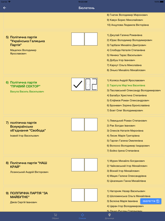 4. Бюлетені відбражаються відповідними кольорами, обрана партія/кандидат відповідно відмічений де це потрібно галочкою і цифрою.