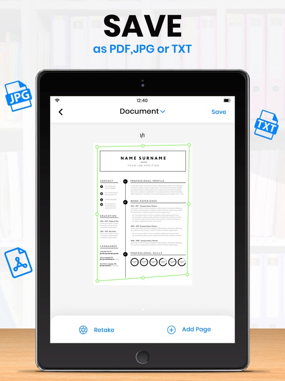 :)Users can scan, save, and upload any document in PDF, JPG, or TXT format by using this App.