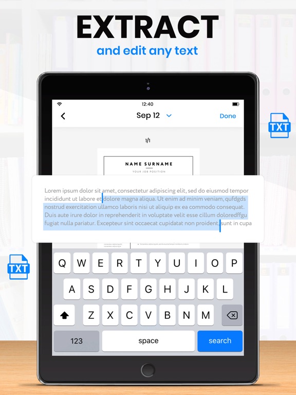 Digitize with the system camera all of your essential papers, or add files from the Folder. You can search various work records, pictures, graphic content, ID cards and files, books, magazines, magazine articles, receipts, business cards, whiteboards, text on various photos, bills, surveys, invoices, research notes, certificates, contracts with your business partners and customers and more! If you manage a lot of business papers the e-sign feature of the app will be a real time-saver for you. Scan, sign, and email documents to your partner or client – yes, with our PDF scanner, it's that simple and easy! You can also save your signature for all other papers, and use it.