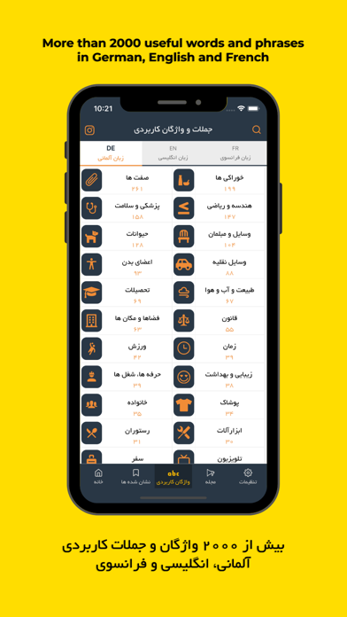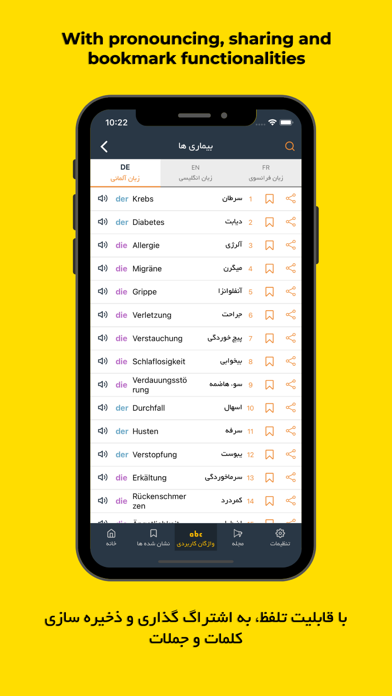 به بیش از ۲۰۰۰ واژگان و جملات کاربردی به زبان های آلمانی، انگلیسی و فرانسوی به صورت دسته بندی شده با امکان تلفظ، ذخیره سازی و به اشتراک گذاری دسترسی داشته باشید.