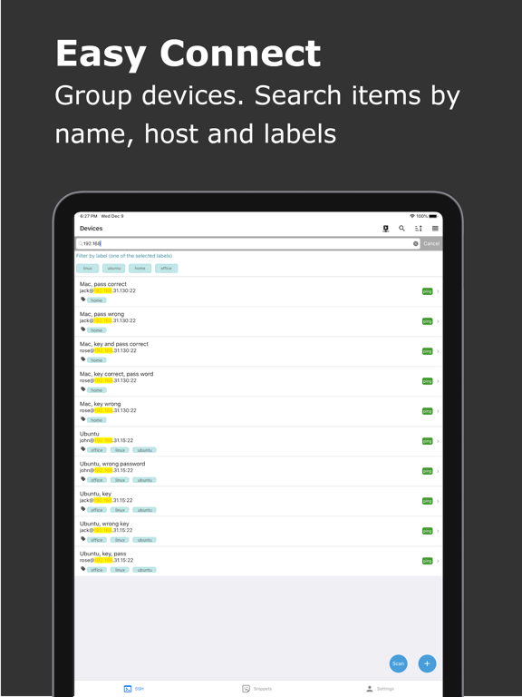 * Device management. Add all your SSH servers, Group devices by labels. Search routers by name, host, or labels. Connect by password or publickey authentication.