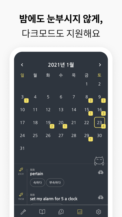 • 달력으로 매일 매일 새로 추가한 단어들을 볼 수 있어요.