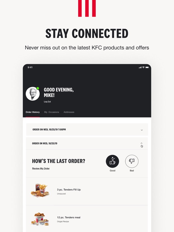Ordering world famous fried chicken has never been easier. Skip the lines and access exclusive deals with the new KFC app. One-Click Reordering All your favorites right at your fingertips. Order Tracking Get updates on your order along the way. Faster Checkout Quick, easy and contactless. Stay Connected Never miss out on the latest KFC products and offers.