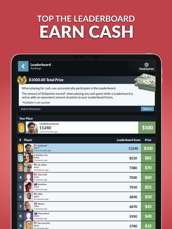 • The more Skill Points you earn, the higher you will rank in our Leaderboard, where top players are rewarded with real cash prizes every week.