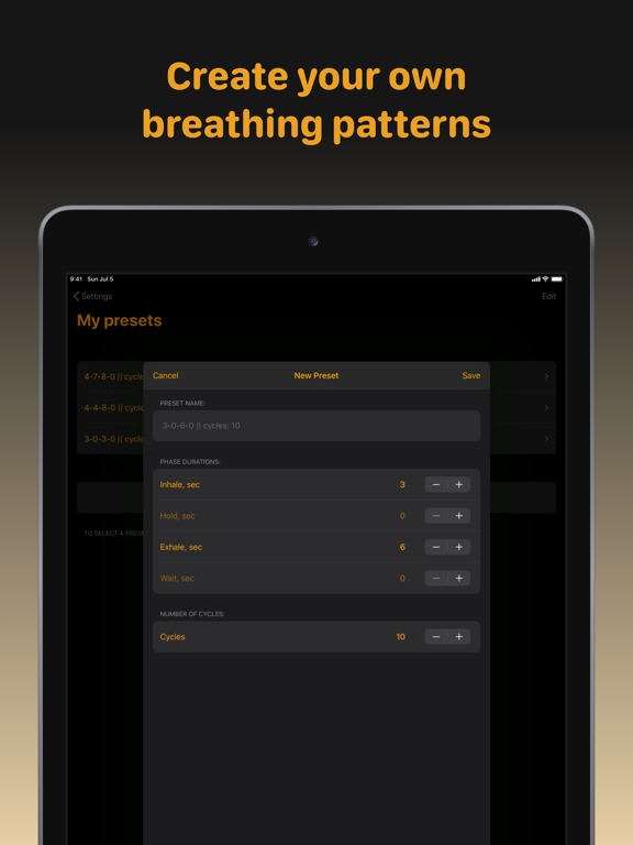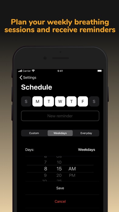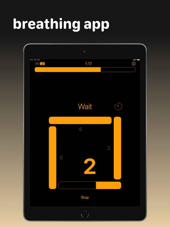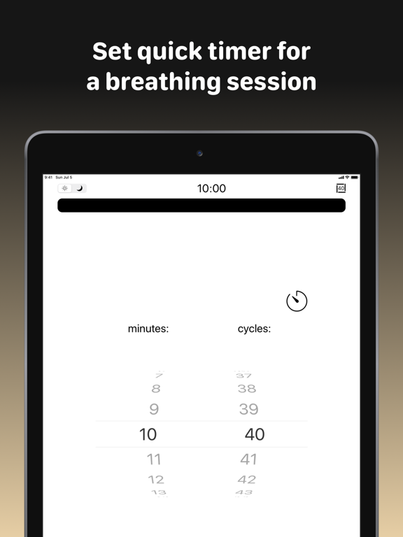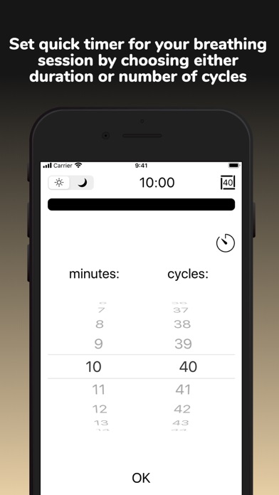 - program your breathing session with a convenient timer by setting either a number of breathing cycles or an overall duration