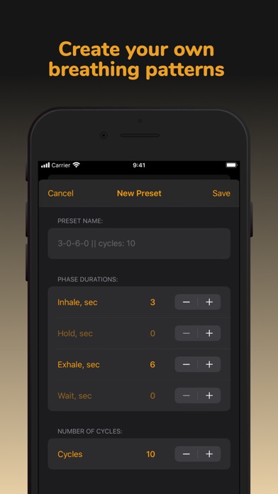 - save your breathing patterns and quickly access them from a context menu on main screen