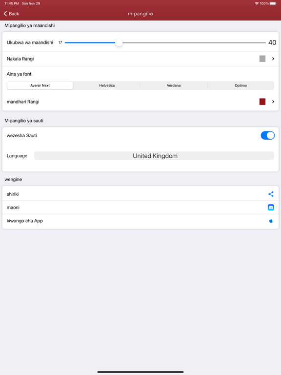 Inajumuisha mipangilio ya saizi ya fonti, pamoja na sauti ya sura zote za Biblia (