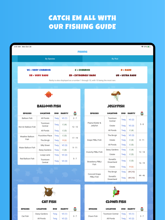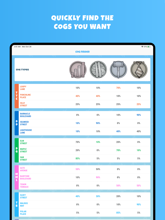 The app also helps you find Cog Types on the many streets of TTR, and has a built in Fishing Guide!