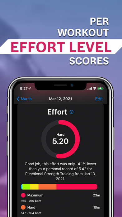Even if you log a workout with another app you can still see workout statistics like calories burned, heart rates, Vo2 Max, and Heart Rate Recovery. Athlytic even has a proprietary Effort Score on a 0-10 scale to see how far you’ve pushed yourself. It also coaches you to tell you how far off of your PR or average the Effort was for each type of workout type.
